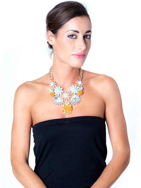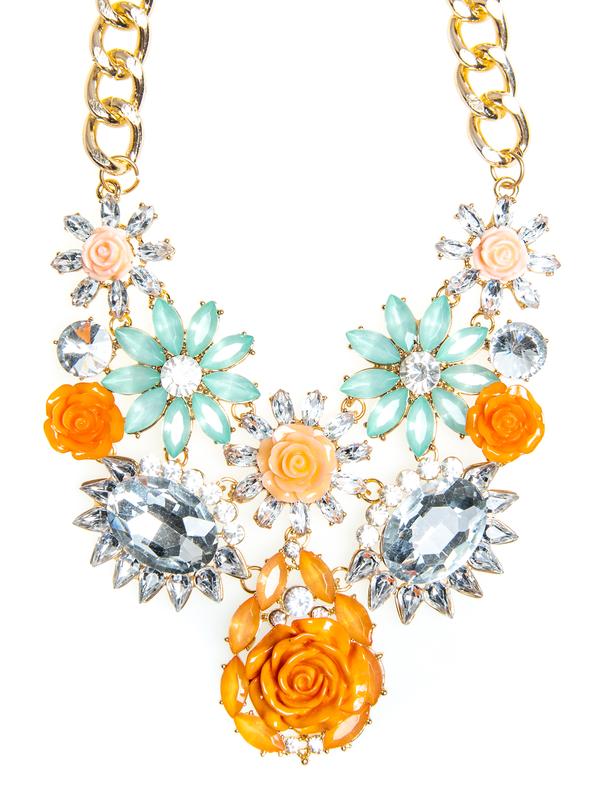 Floral necklace with braid cord and oval cut gemstones, flower details