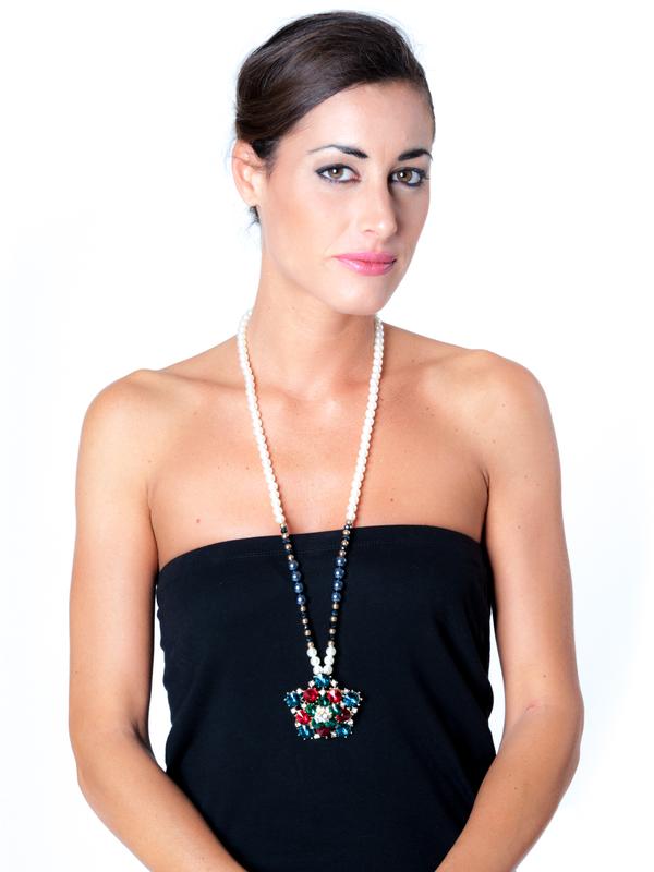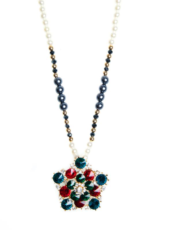 Pendant with pearl chain, multicolor rose cut gemstones and crystal details