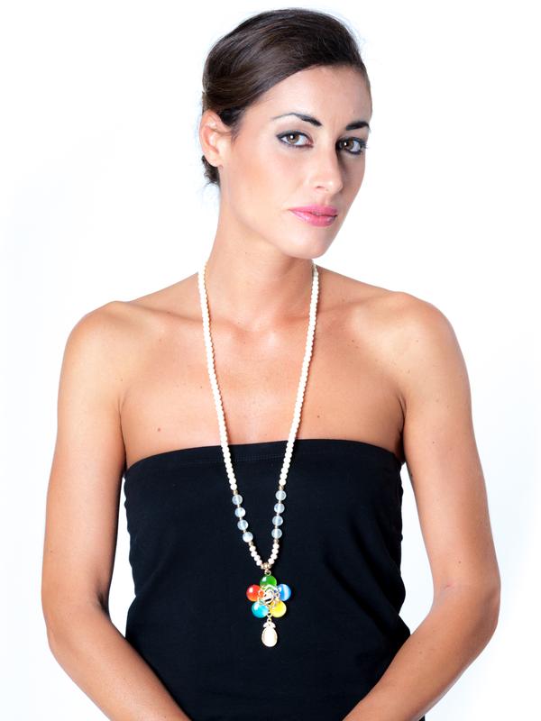 Flower pendant with pearl chain, multicolor gemstones and crystal details