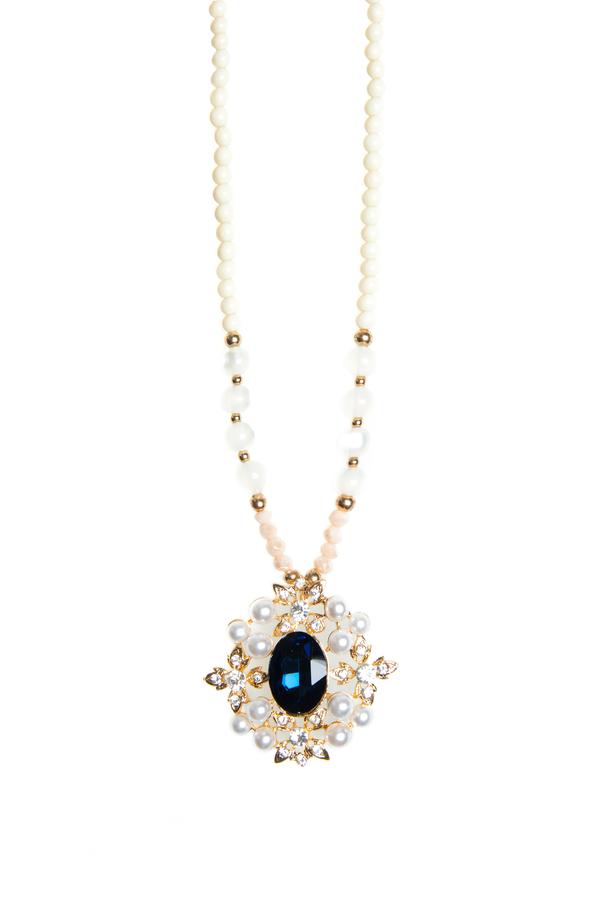 Flower pendant with pearl chain, blue oval cut gemstone and crystal details