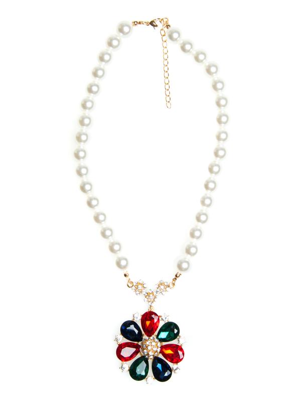 Flower pendant with pearl chain, multicolor pear cut gemstones and crystal details