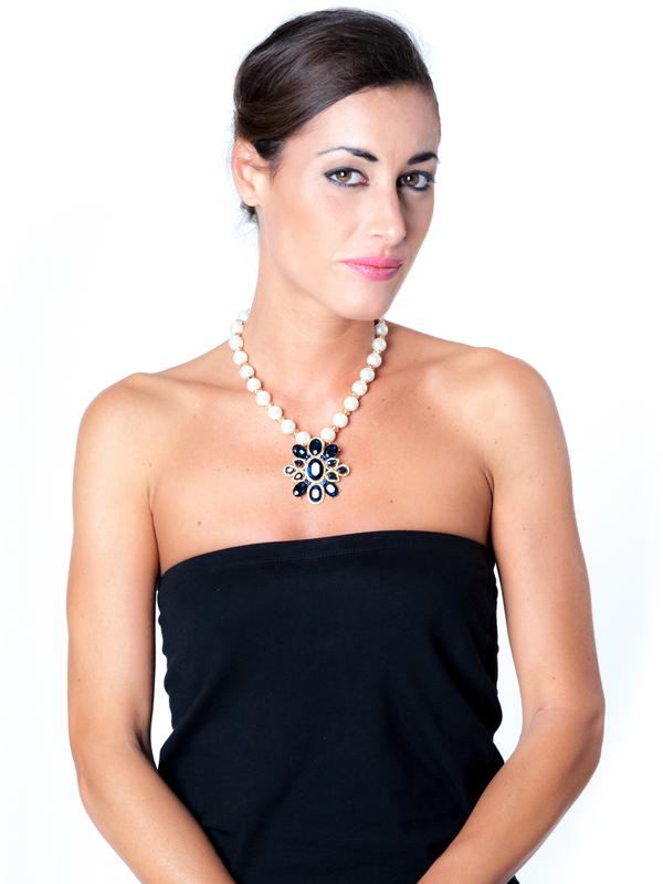 Flower pendant with pearl chain, blue oval cut gemstones details