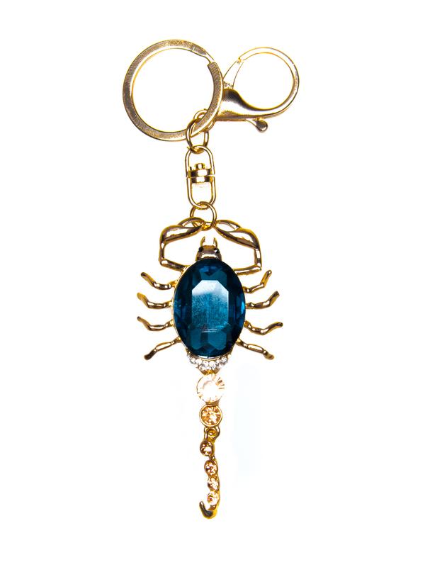 Scorpion keychain with blue oval cut gemstone and crystal details